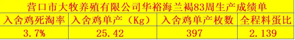 *83周產(chǎn)蛋率維持在83.71%,較海蘭標(biāo)準(zhǔn)上線高出8.71%。