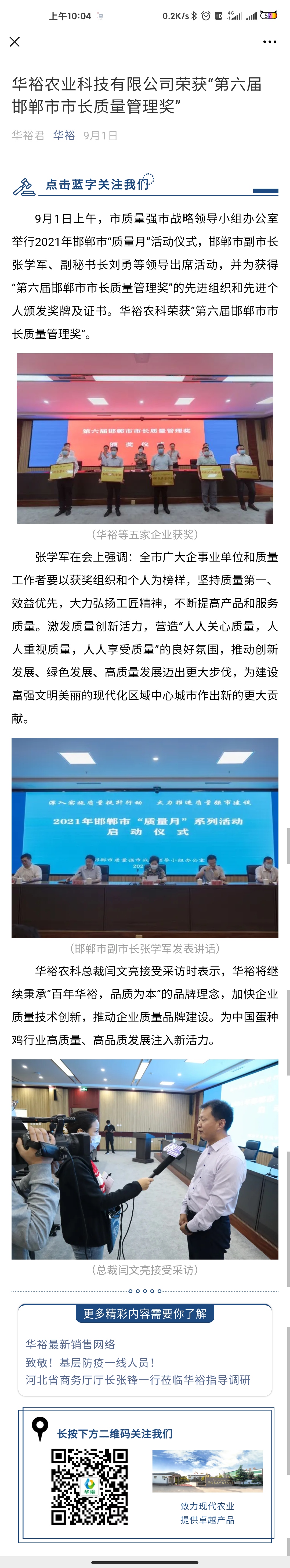 華裕農業(yè)科技有限公司榮獲“第六屆邯鄲市市長質量管理獎”
