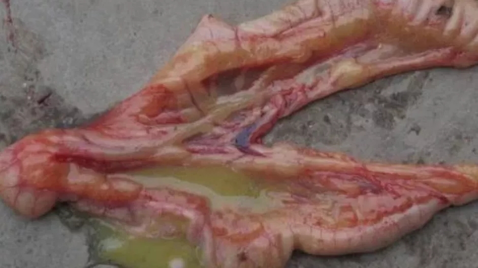 剖檢可見腸道擴(kuò)張,腸內(nèi)充滿液體、氣體,腸壁變薄,腸粘膜脫落,肝臟顏色變淺,有時(shí)表面有壞死灶,腎臟腫大、萎縮,顏色蒼白或有白色尿酸鹽沉積。